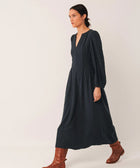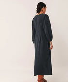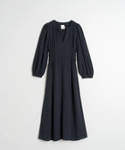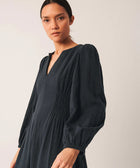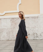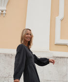 Ein wuuunderschönes Kleid aus Krepp-Baumwollgaze mit voluminösen Ärmeln und elastischen Einsätzen in der Taille, die die Silhouette leicht formen. Es hat schmal geschnittene Schultern und elastische Ärmelabschlüsse. Der Schnitt ist körpernah, ohne einzuengen.