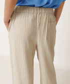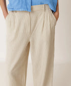 Hose aus gestreifter Bio-Baumwolle mit hoher Taille. Sie hat Bundfalten vorne, einen elastischen Einsatz am Rücken und seitliche Eingrifftaschen. Auf der Rückseite befindet sich eine aufgesetzte Tasche. Die lockere Passform sorgt für einen bequemen Sitz.