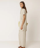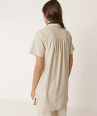 Locker geschnittenes Kleid aus gestreifter Bio-Baumwolle mit Polokragen und Knopfleiste. Es hat kurze Ärmel, große aufgesetzte Taschen und kleine Seitenschlitze am Saum. Kann als kurzes Kleid oder als lange Bluse getragen werden.