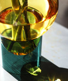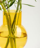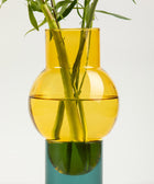 Die Vase Bubble Tube besteht aus zwei Glaselementen und überzeugt durch klare Form und feine Farbnuancen. Die große Vase in bernsteinfarbenem Glas steht auf einem zylindrischen Sockel in zartem Rosa – das verleiht ihr Leichtigkeit und einen fast schwebenden Ausdruck.